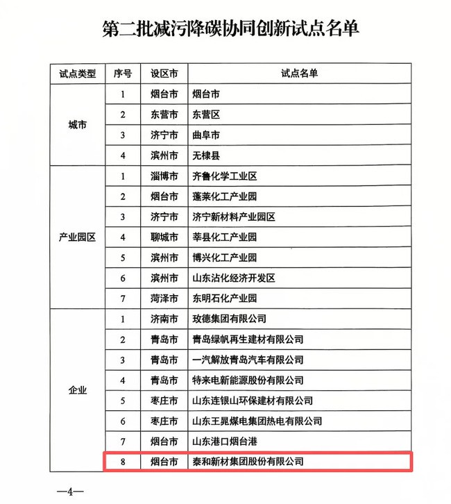 泰和新材成功入选山东省减污降碳协同创新第二批试点企业。这标志着公司正式成为区域减污降碳协同增效的标杆实践者,依托政策支持与技术创新,探索行业可复制的绿色发展路径。