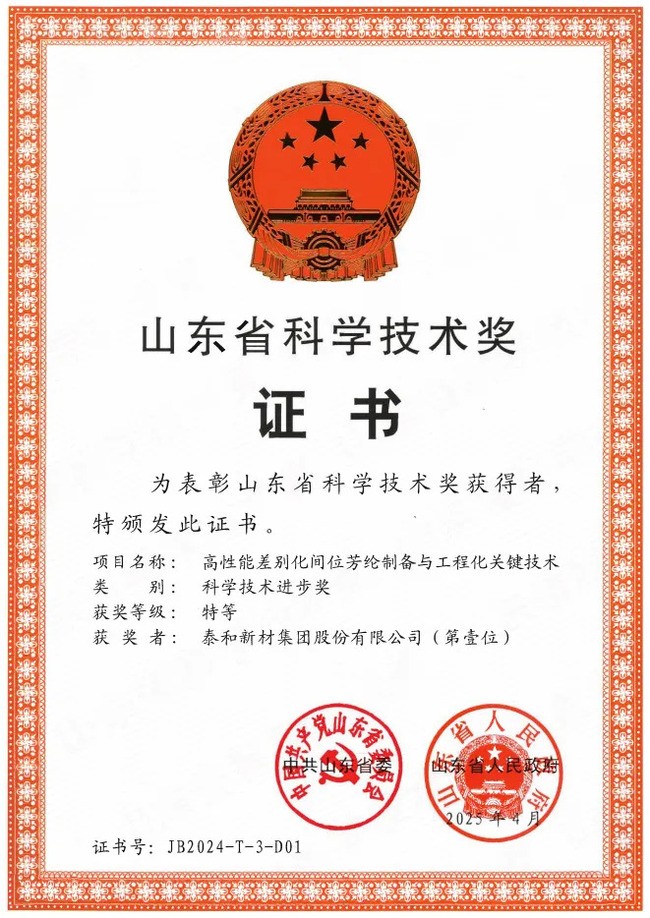 泰和新材凭借“高性能差别化间位芳纶制备与工程化关键技术”项目荣获“2024年度山东省科学技术进步特等奖”。